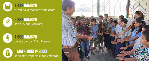 La campagna contro i matrimoni precoci avviata nel 2014, in collaborazione con le autorità del distretto, ha contribuito l’anno scorso a impedire che 5 bambine venissero date in spose dalle loro famiglie. Inoltre, 1.600 bambini hanno partecipato ai Child Forum, piccoli consessi dove anche i più piccoli possono condividere opinioni e discutere dei loro diritti, partecipare ad attività ludiche, didattiche e culturali.