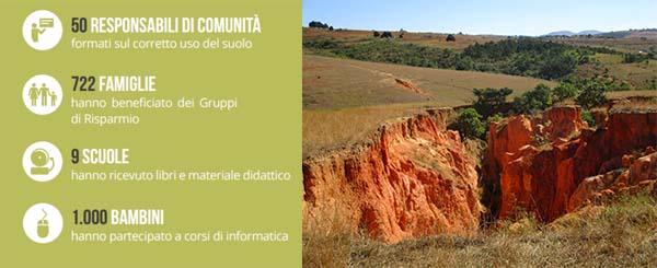 Nell’area di Ekukhanyeni in Swaziland, abbiamo formato 50 responsabili delle comunità sulla gestione e l’uso corretto del suolo, e abbiamo affiancato il Ministero dell’Agricoltura per piantare 200 alberi della gomma. Inoltre, tutte le comunità di Ekukhanyeni hanno ricevuto formazione sulla prevenzione dei disastri naturali, che colpiscono il paese a causa dei cambiamenti climatici. Il suolo del paese è infatti degradato e anche in seguito alle forti piogge causa fenomeni importanti di erosione del suolo (profondi smottamenti chiamati "donga").