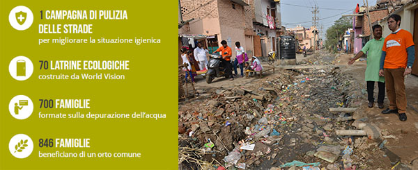 Nelle baraccopoli di Faridabad in India, solo il 15% delle famiglie ha accesso ai servizi igienici e non esiste un sistema fognario di scarico. L’anno scorso sono state costruire 70 latrine ecologiche e 700 famiglie sono state preparate sui metodi di depurazione dell’acqua. Inoltre, World Vision ha avviato una campagna di pulizia delle strade, sostenuta anche da 4 Parlamenti dei Bambini che abbiamo istituito, gruppi dove i bambini possono apprendere i propri diritti e provare a esercitarli, per essere parte attiva nel processo di sviluppo.
