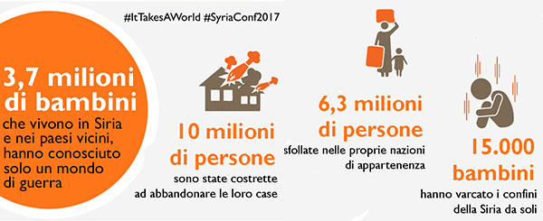 Mentre i leader mondiali e la comunità internazionale sono riuniti a Bruxelles per discutere del futuro della Siria e dei paesi limitrofi, noi siamo preoccupati per le conseguenze della guerra siriana sui bambini, che si trovano a vivere la più grave crisi umanitaria dalla Seconda Guerra Mondiale. La violenza, il lavoro minorile, i matrimoni precoci e la guerra stessa sono ormai considerati “la quotidianità” da molti bambini siriani. Dobbiamo garantire la protezione dei civili, in particolare dei bambini più vulnerabili, la distribuzione degli aiuti umanitari e la creazione di una soluzione politica duratura al conflitto.
